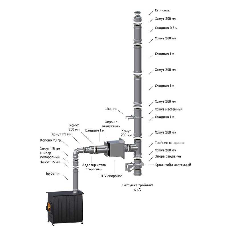 • если высота дымохода более заявленной в комплекте, используйте прямой участок дымохода - элементы труба/сэндвич труба