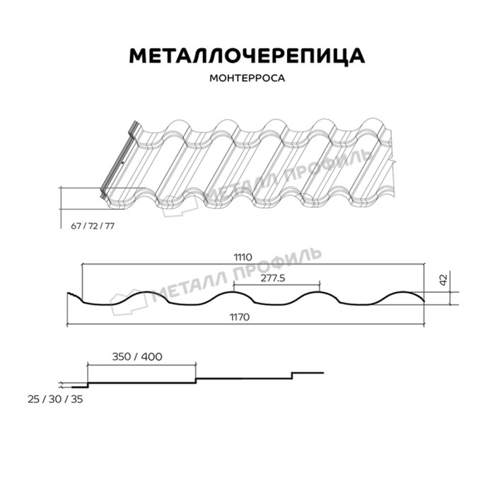 Данный профиль органично сочетает в себе высокий рельеф и плавность очертаний. Хоть Монтерроса® и высокий профиль, но места соединений металлочерепицы практически неразличимы благодаря фигурному резу нижней кромки. Усовершенствованные боковые замки обеспечивают водонепроницаемость кровли. Чтобы придать дому особую выразительность, при покупке черепицы можно варьировать высоту и длину ступеньки. Металлочерепица Монтерроса® выпускается с различными покрытиями из ассортимента компании «Металл Профиль». Таким образом, ваша кровля приобретает респектабельный внешний вид и надёжность. Металлочерепица Монтерроса® изготавливается из качественного сырья. Это значит, что вы гарантированно приобретаете долговечную и надёжную кровлю со стальной основой и полимерным покрытием.